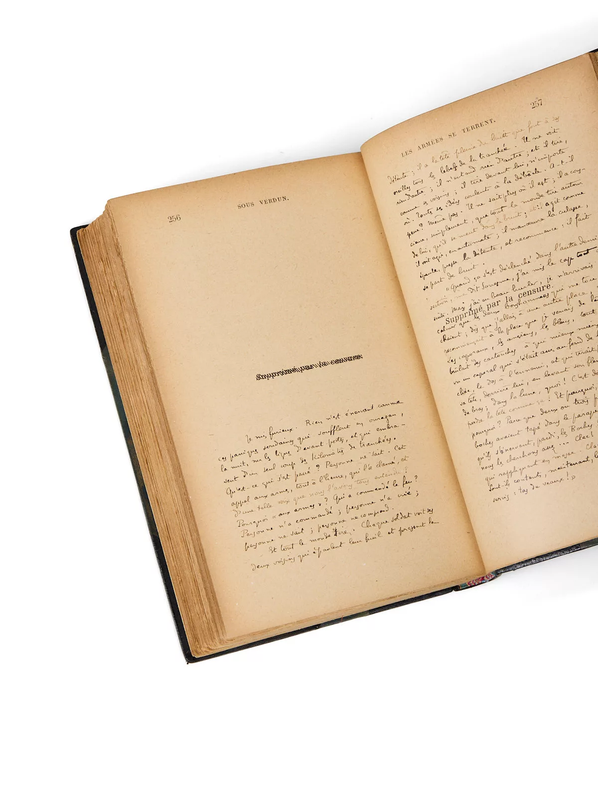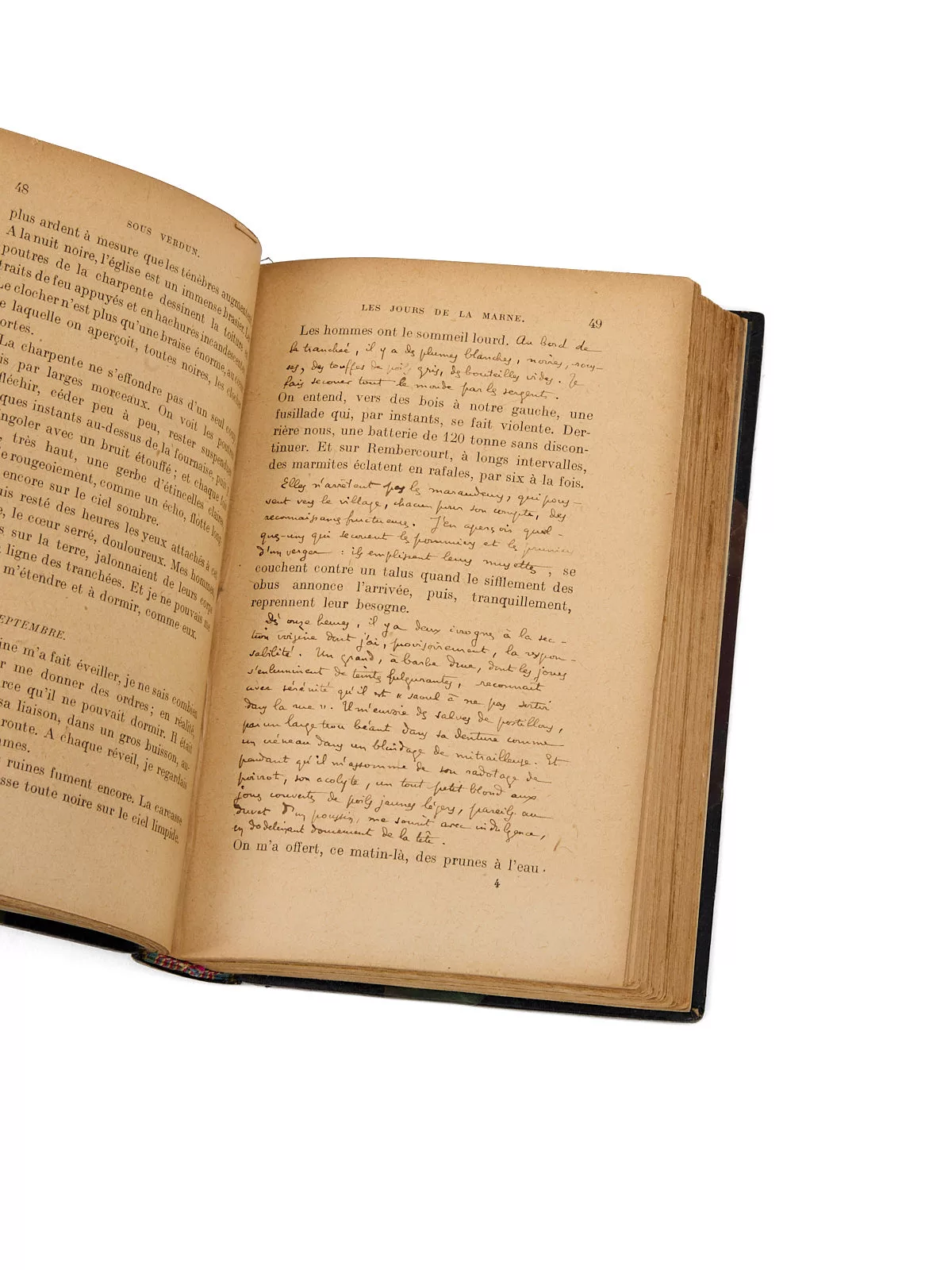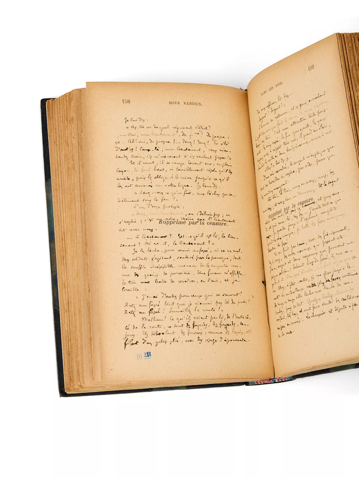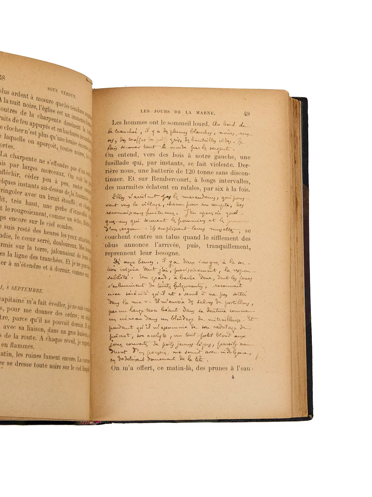 Édition originale. Préface d'Ernest Lavisse.Exemplaire exceptionnel, dans lequel Maurice Genevoix a restitué de sa main tous les passages censurés à la parution du volume. Les passages manuscrits apparaissent en marge ou directement recopiés dans les blancs laissés et signalés par des « … » et dans les sections imprimées « Supprimé par la censure », soit aux pages 7, 14, 21, 27, 31, 47, 49, 54, 56, 62, 78, 83, 84, 94, 134, 140–143, 150, 154, 156–159, 167, 179–181 et 256–257. En outre, Genevoix identifie les noms réels des soldats et officiers évoqués dans le texte, initialement masqués ou abrégés. Exemplaire avec son ex-libris manuscrit daté « 1915-1916 ». Il comporte, en sus des corrections, une note manuscrite bouleversante inscrite en marge d'un passage qui sera sciemment supprimé - cette fois-ci par l'auteur - dans l'édition suivante.