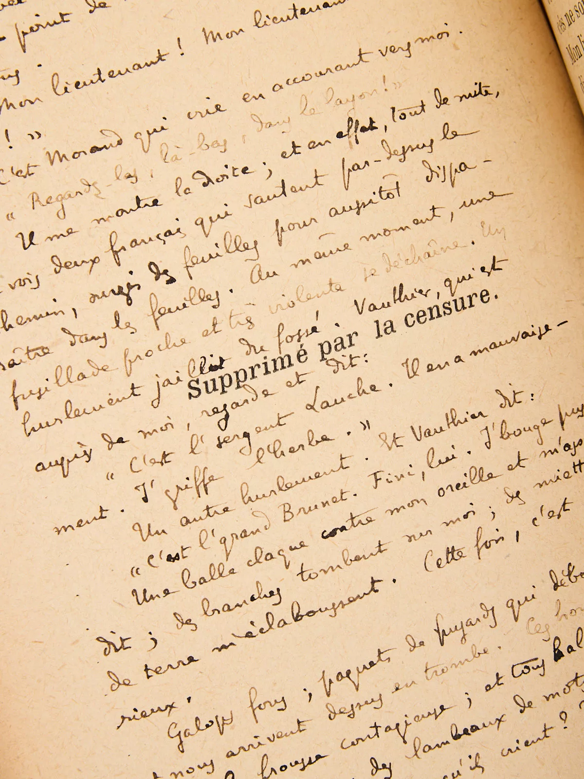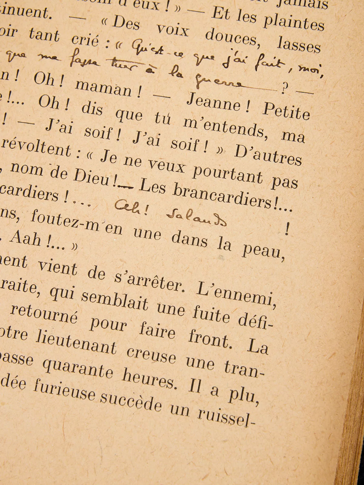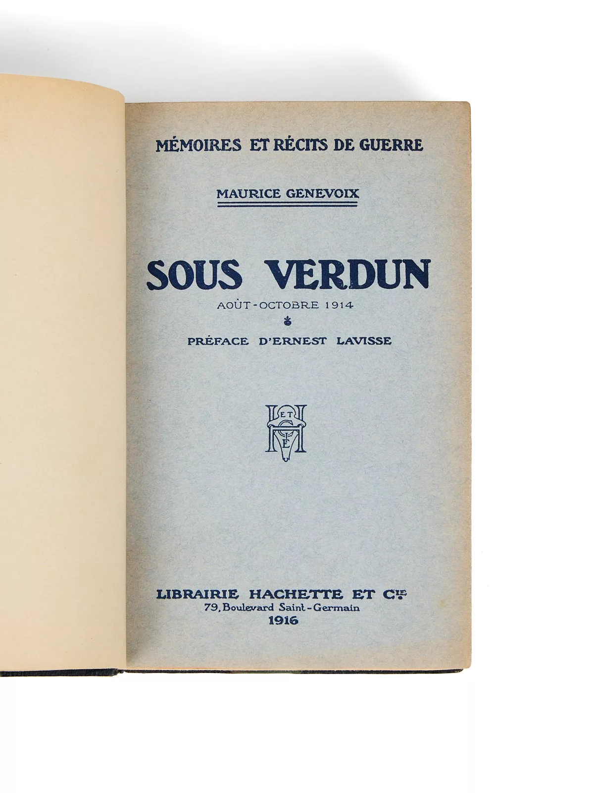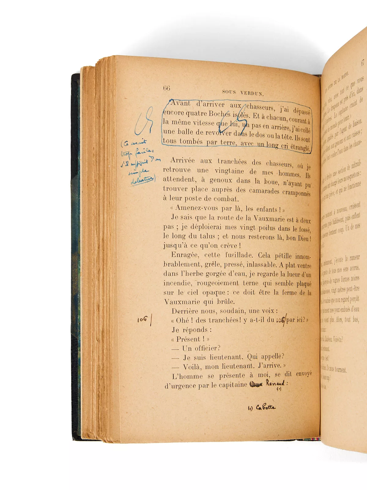 Édition originale. Préface d'Ernest Lavisse.Exemplaire exceptionnel, dans lequel Maurice Genevoix a restitué de sa main tous les passages censurés à la parution du volume. Les passages manuscrits apparaissent en marge ou directement recopiés dans les blancs laissés et signalés par des « … » et dans les sections imprimées « Supprimé par la censure », soit aux pages 7, 14, 21, 27, 31, 47, 49, 54, 56, 62, 78, 83, 84, 94, 134, 140–143, 150, 154, 156–159, 167, 179–181 et 256–257. En outre, Genevoix identifie les noms réels des soldats et officiers évoqués dans le texte, initialement masqués ou abrégés. Exemplaire avec son ex-libris manuscrit daté « 1915-1916 ». Il comporte, en sus des corrections, une note manuscrite bouleversante inscrite en marge d'un passage qui sera sciemment supprimé - cette fois-ci par l'auteur - dans l'édition suivante.