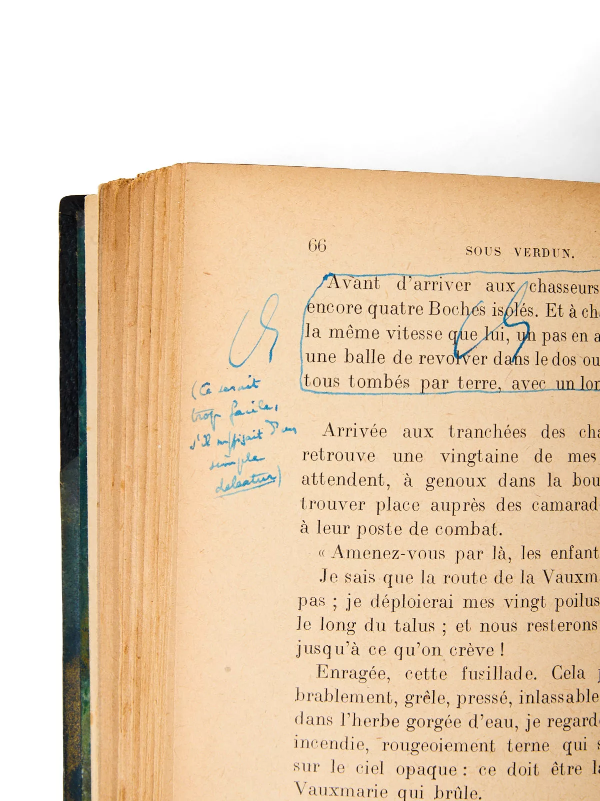 En même temps, sans commenter sa décision, il fit retirer de cette nouvelle édition un paragraphe, un seul : celui, bouleversant, de la page 66 où il raconte avoir tué, pendant le combat de la Vaux-Marie, quatre assaillants : « Avant d’arriver aux chasseurs, j’ai dépassé encore quatre Boches isolés. Et à chacun, courant à la même vitesse que lui, un pas en arrière, j’ai collé une balle de revolver dans le dos ou la tête. Ils sont tous tombés par terre, avec un long cri étranglé ».