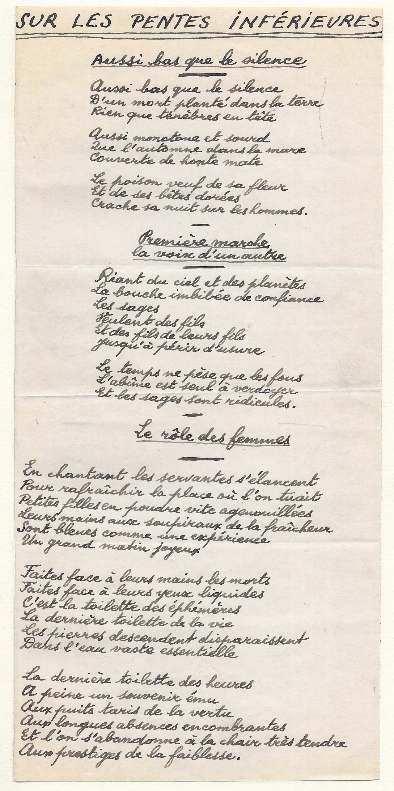 au premier feuillet, le titre est inscrit en capitales et souligné deux fois, puis « Aussi bas que le silence », « Première marche la voix d’un autre », « Le rôle des femmes » ;