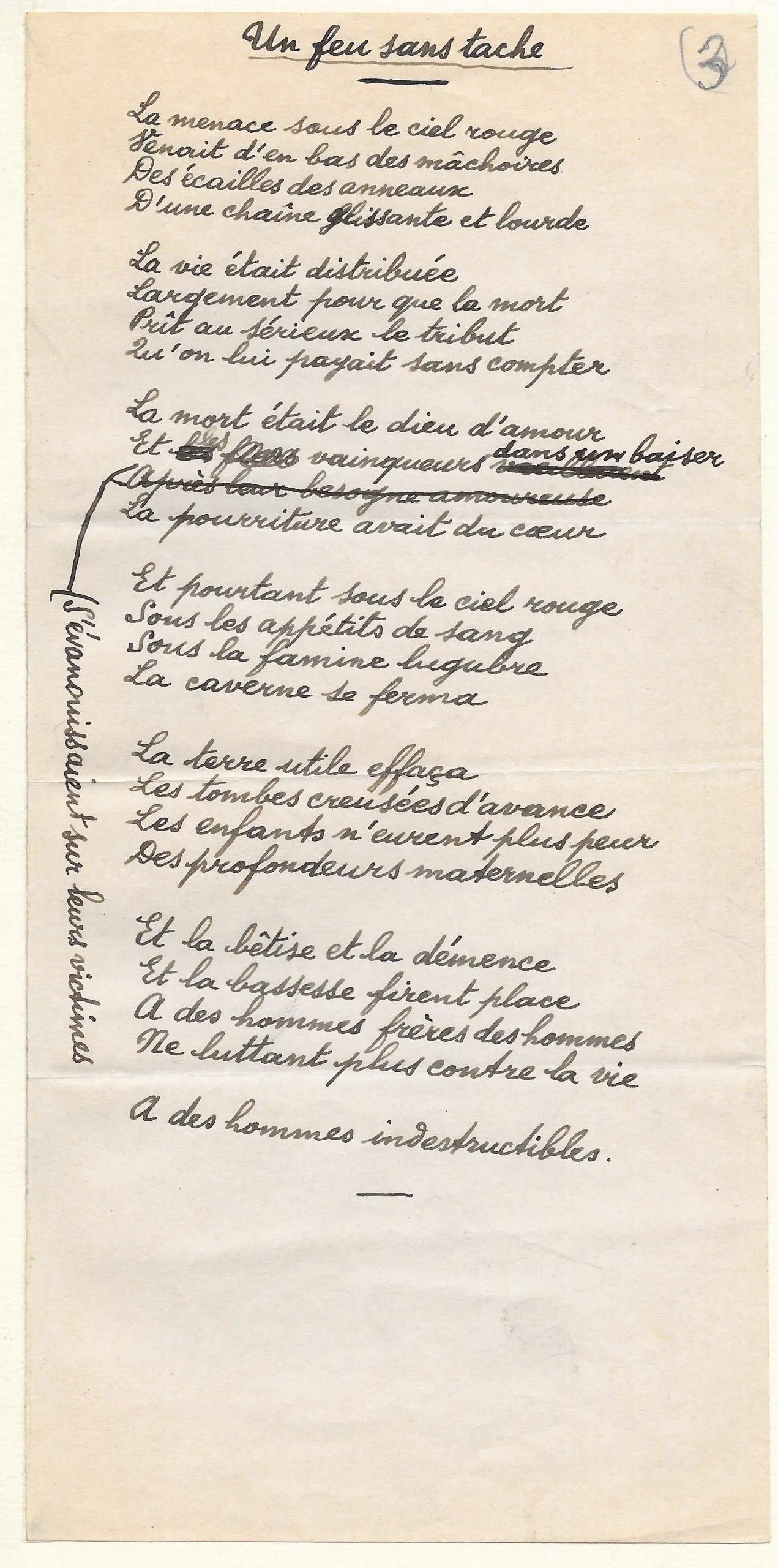 sur le troisième feuillet, « Un feu sans tache », qui comprend des corrections : Eluard a d’abord rédigé les deuxième et troisième vers du quatrième quatrain identique au manuscrit de Georges Blaizot (OEuvres complètes, t. I, p. 1597) : « Et les fiers vainqueurs vacillaient / Après leur besogne amoureuse » ; qu’il a corrigé en : « Et les vainqueurs dans un baiser / s’évanouissaient sur leurs victimes ».
