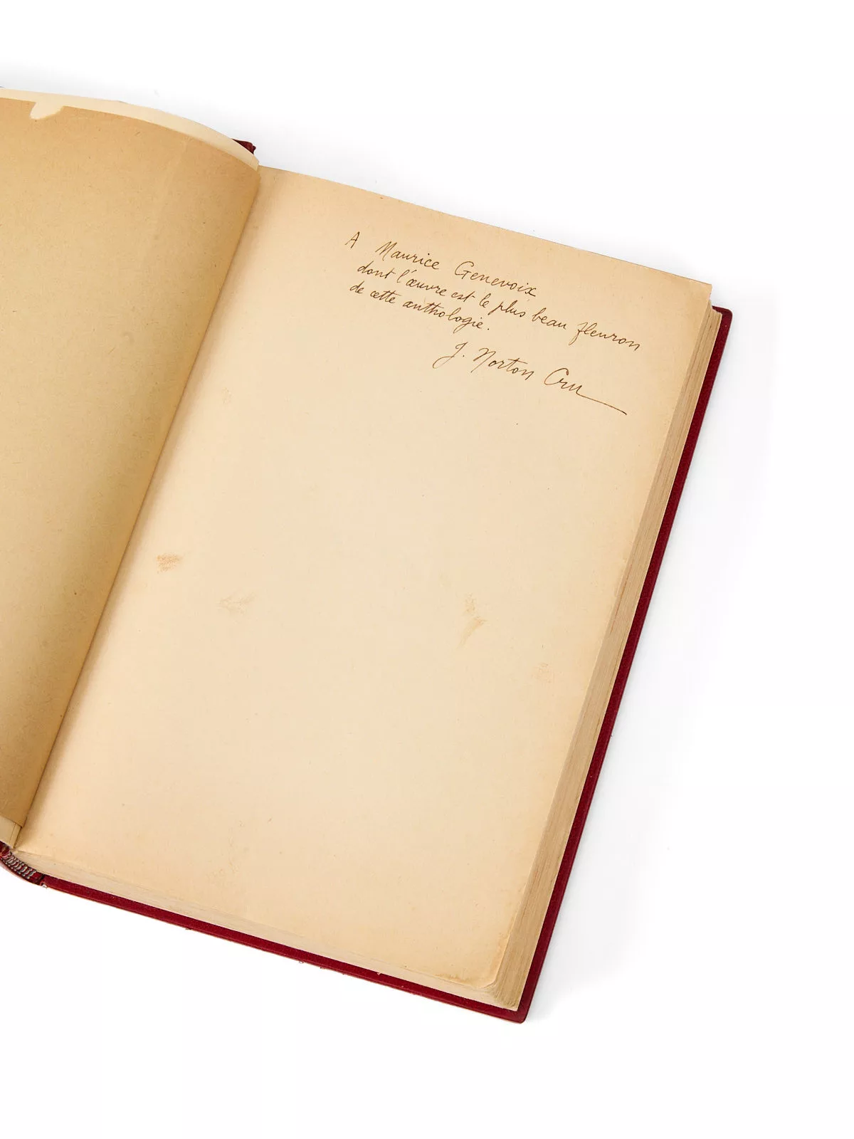 Envoi signé : « à Maurice Genevoix, dont l'œuvre est le plus beau fleuron de cette anthologie. Norton-Cru ».