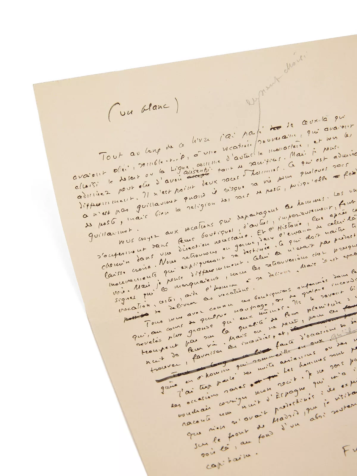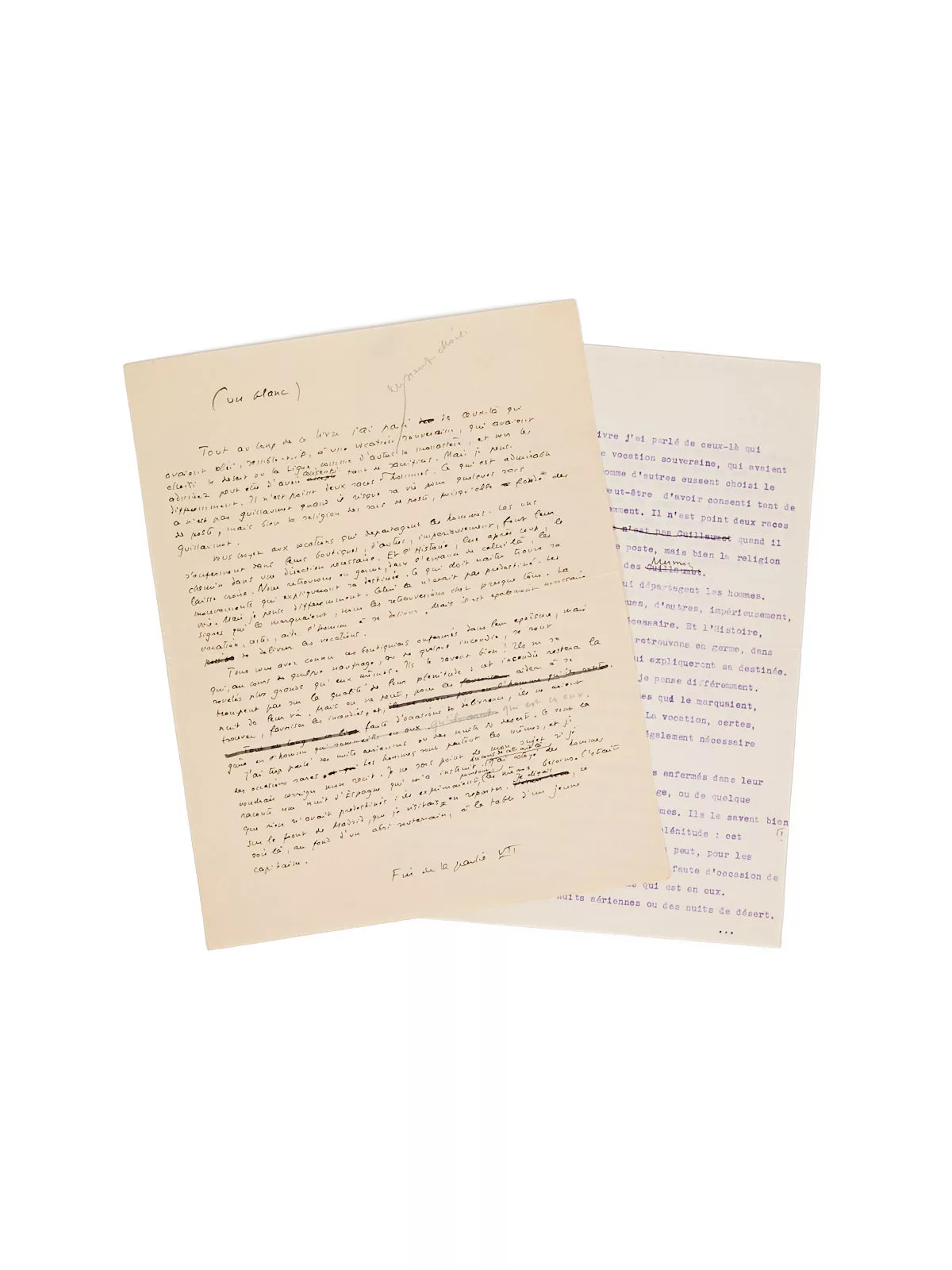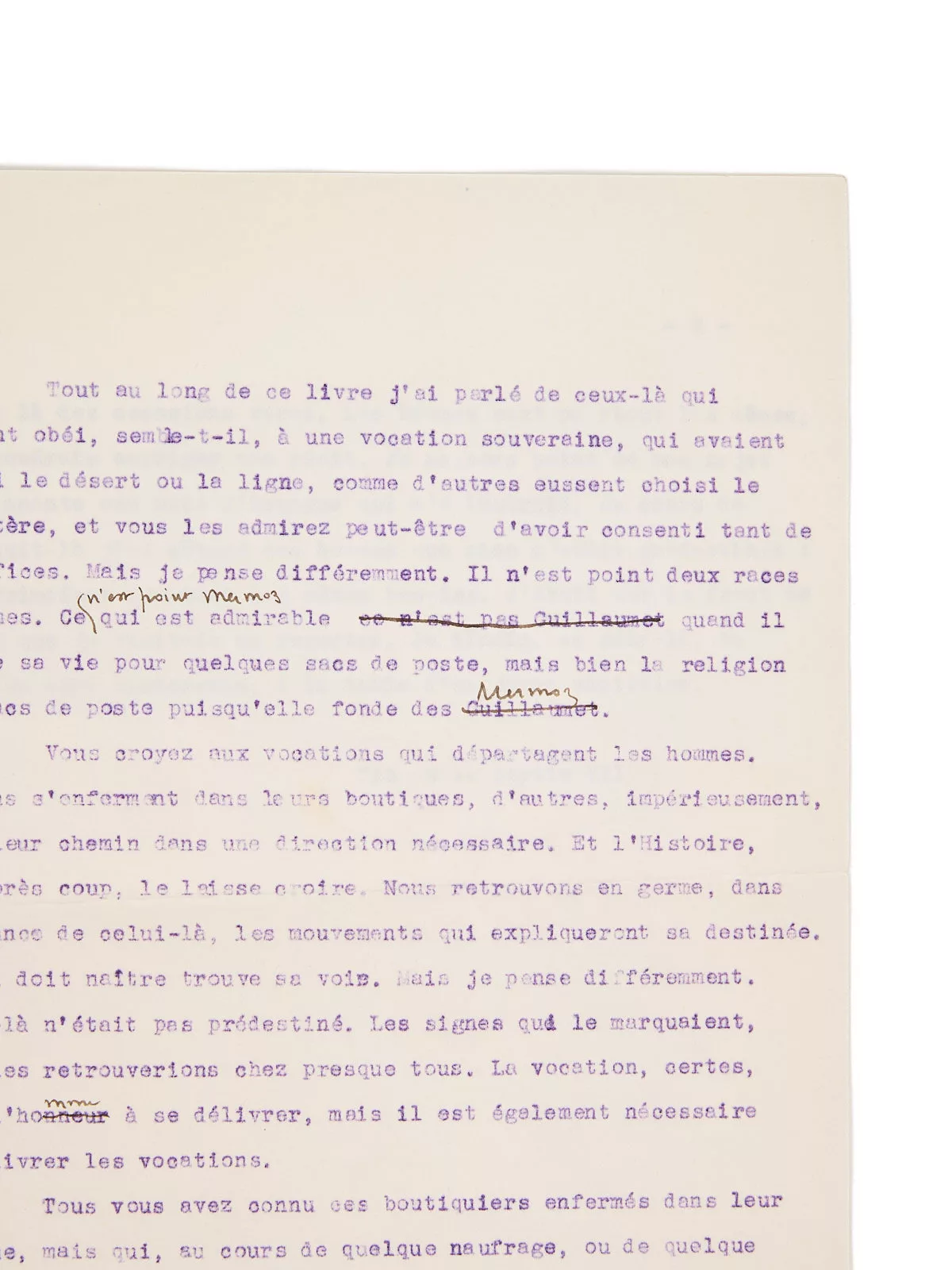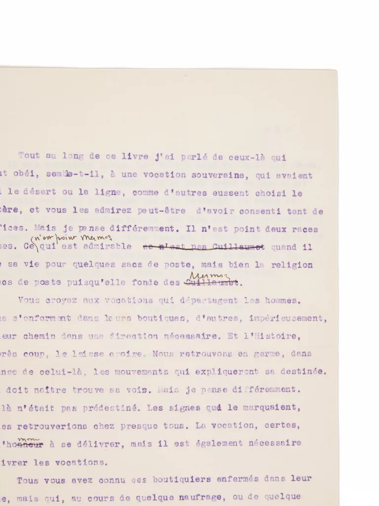 Précieux manuscrit, avec plusieurs variantes et repentirs par rapport au texte imprimé. Le manuscrit fait notamment référence à Mermoz et Guillaumet (Saint-Exupéry inversant par ailleurs leur place entre le manuscrit et le tapuscrit, pour finalement supprimer ce passage dans la version éditée). La place accordée aux deux pionniers de l’Aéropostale, si chers amis de l’auteur, avait jusque-là été prépondérante dans Terre des hommes.
