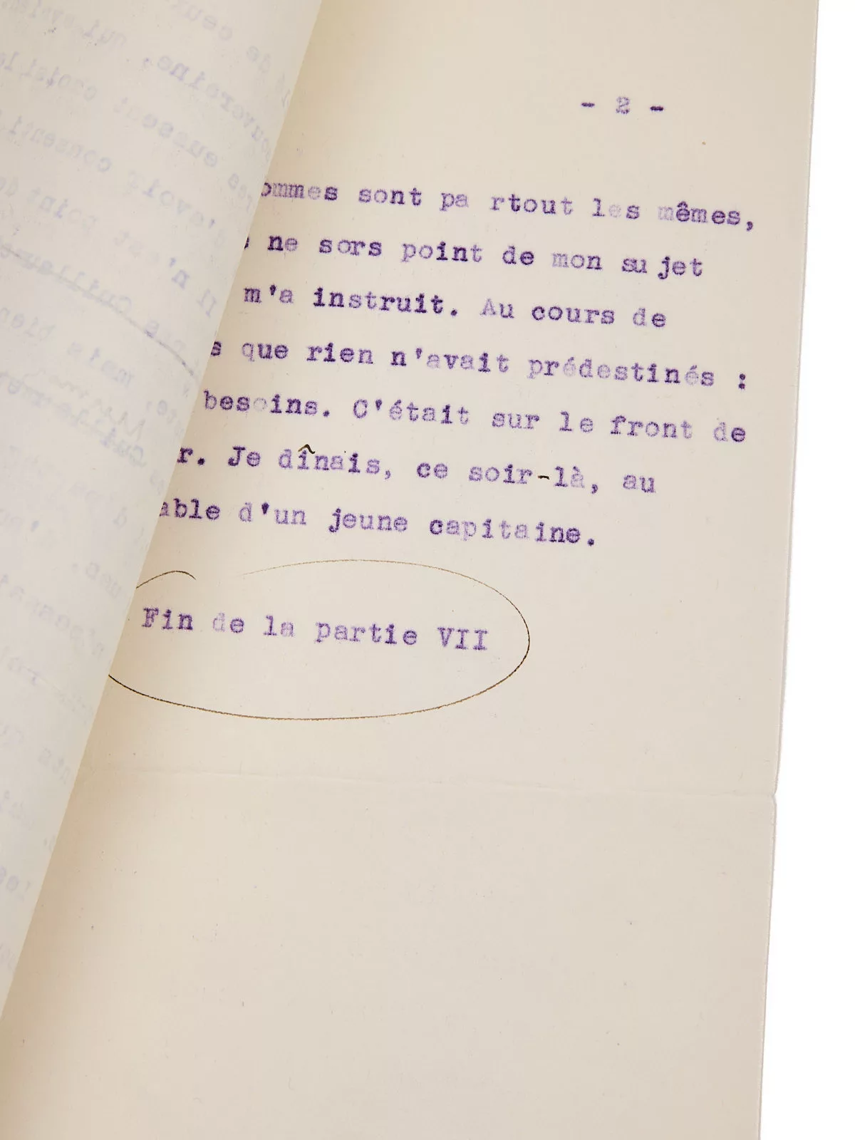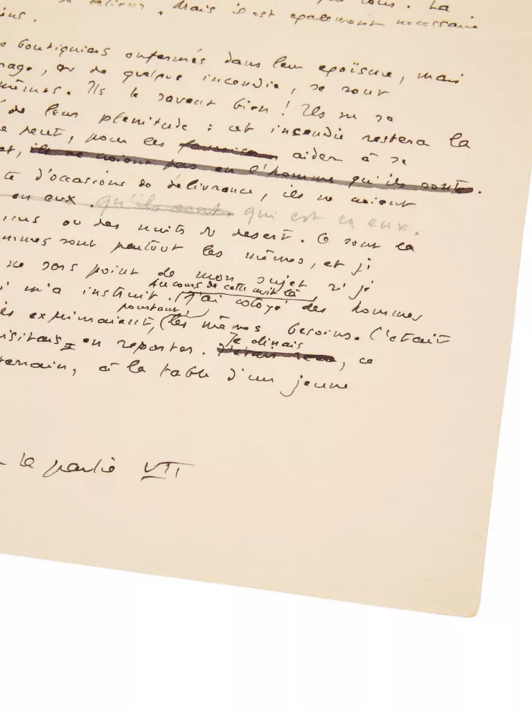Le manuscrit prend fin avec cette note : « Fin de la partie [VII] », ce qui signifie qu’à l’origine, Saint-Exupéry ne l’intègre pas encore dans le chapitre VIII « Les hommes », qu’il souhaite directement aborder par le récit du front de Carabancel. Finalement, ce long préambule lui servira d’introduction.