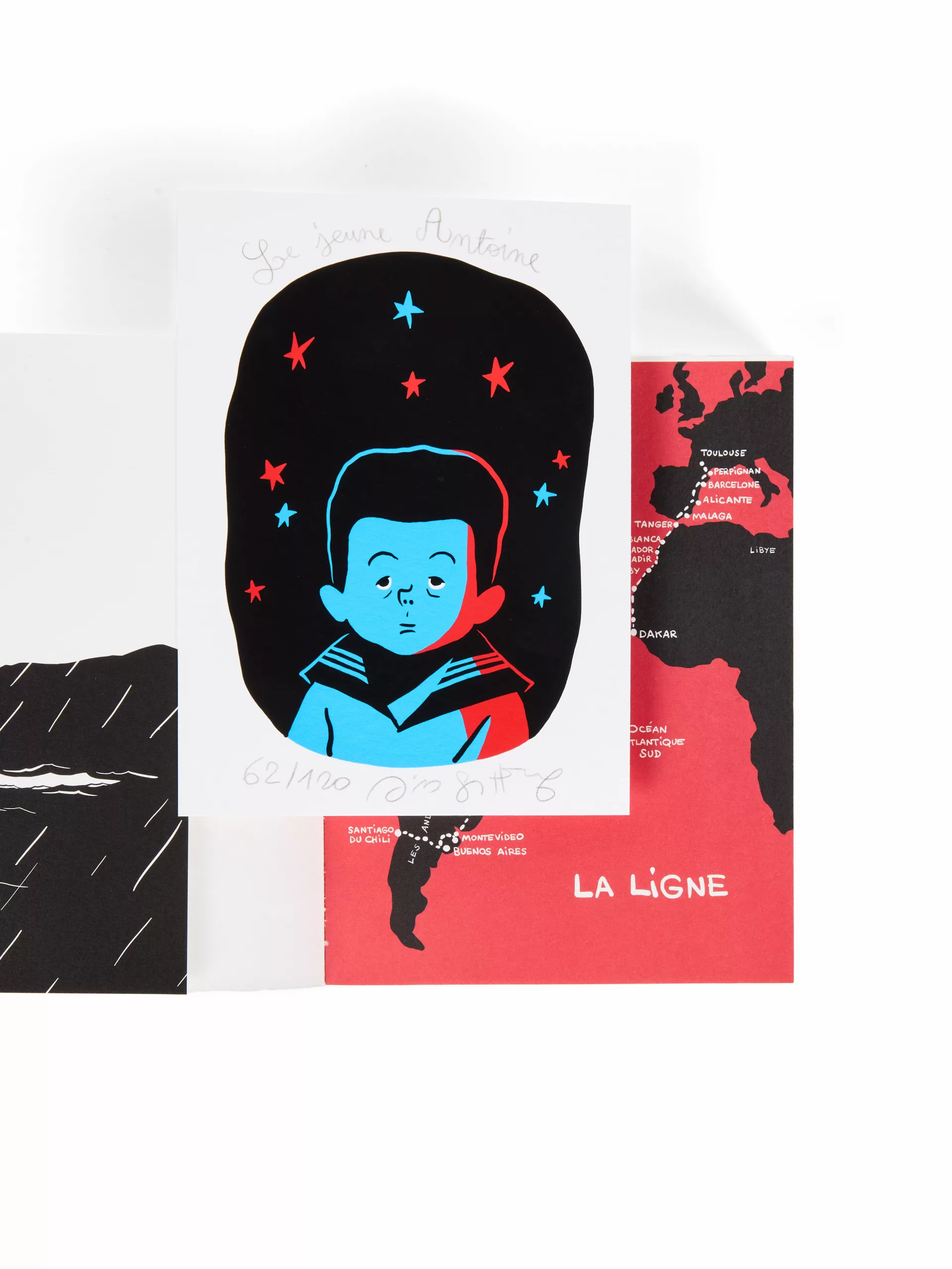 Paru en 1939, Terre des hommes demeure l’un des sommets spirituels de Saint-Exupéry : méditation sur l’Aéropostale, journal d’aviation intérieure, manifeste de responsabilité humaine. L’intervention graphique de Sattouf n’en affaiblit ni la gravité ni la densité morale ; elle en révèle au contraire la dimension initiatique, la tension entre enfance intacte et conscience tragique. Cette édition s’accompagne d’une exposition-vente à la Galerie Gallimard (3 octobre 2025 – 17 janvier 2026, prolongation incluse), présentant tirages d’art signés, dessins originaux et un ensemble exceptionnel d’archives issues de collections familiales et éditoriales : manuscrit, tapuscrit corrigé inédit, correspondances, photographies et éditions autographes de 1939, offrant un contrepoint documentaire rare au travail contemporain de l’illustrateur. Exemplaire de tête à la croisée de la bibliophilie moderne, de l’histoire littéraire et de la création graphique actuelle, appelé à devenir une référence durable dans l’histoire éditoriale de Terre des hommes.