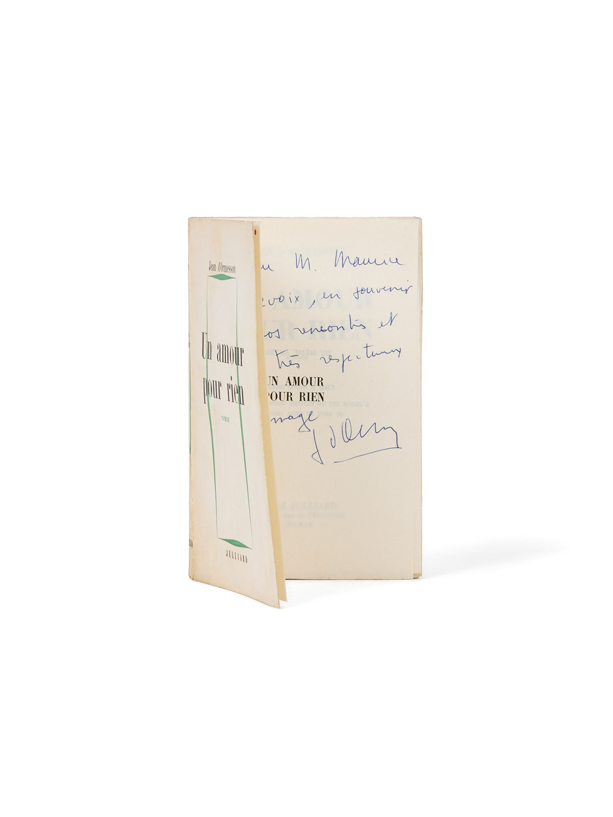 Bel exemplaire qui témoigne de l’attention portée par le jeune romancier à son aîné. L’envoi, strictement contemporain de la parution du roman, donne les prémisses d’une relation qui n’ira que croissante en qualité et en amitié.