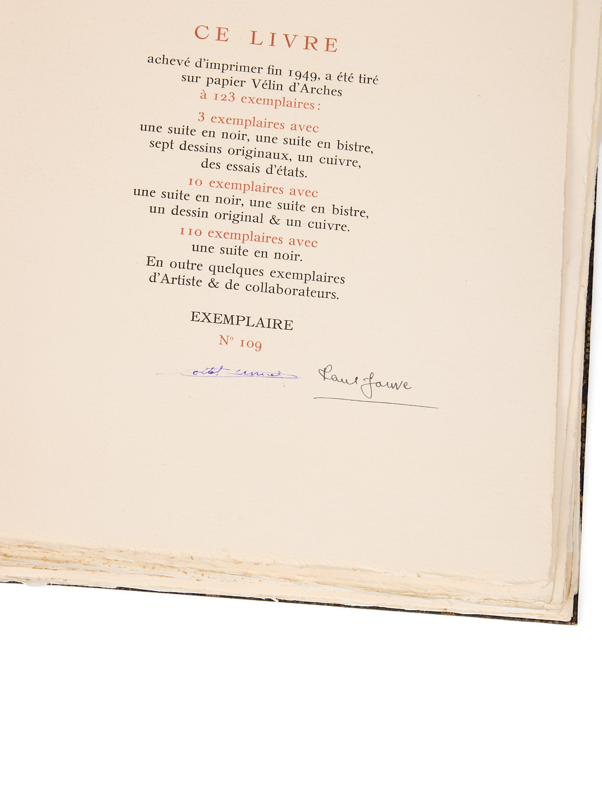 L’exemplaire provient de la bibliothèque de Maurice Genevoix : les deux hommes collaboreront dix ans plus plus tard pour une grande édition du Roman de Renard, pour laquelle Jouve fournira 90 dessins originaux réalisés à l’aquarelle.