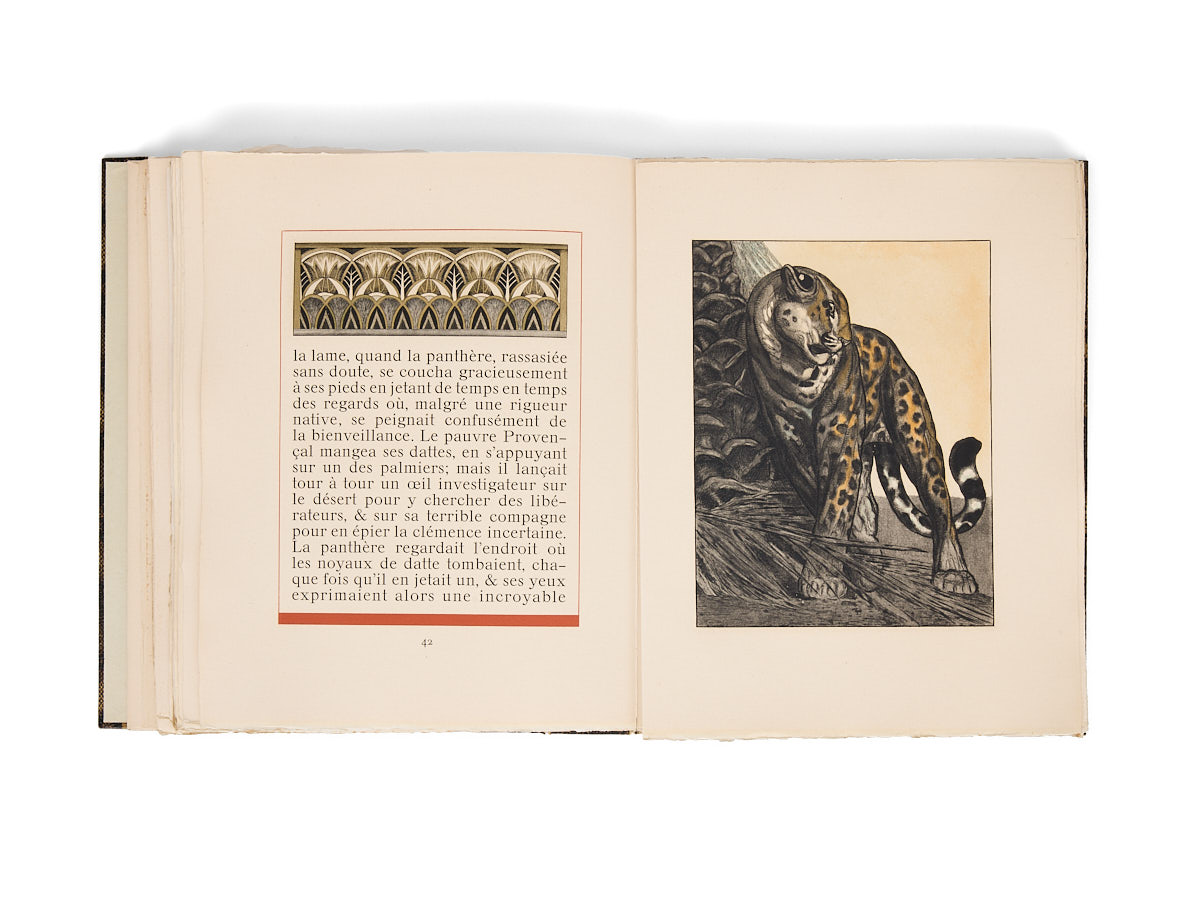 Édition limitée à 123 exemplaires, tous imprimés sur Arches. Illustrations de Paul Jouve gravées à l'eau forte par Haasen ; exemplaire signé par l'artiste et l'éditeur au colophon. Exemplaire avec la suite des illustrations en noir et un dessin original inédit de Paul Jouve, ajouté : seuls les 13 exemplaires de tête contiennent habituellement un dessin original, (n° 110).
