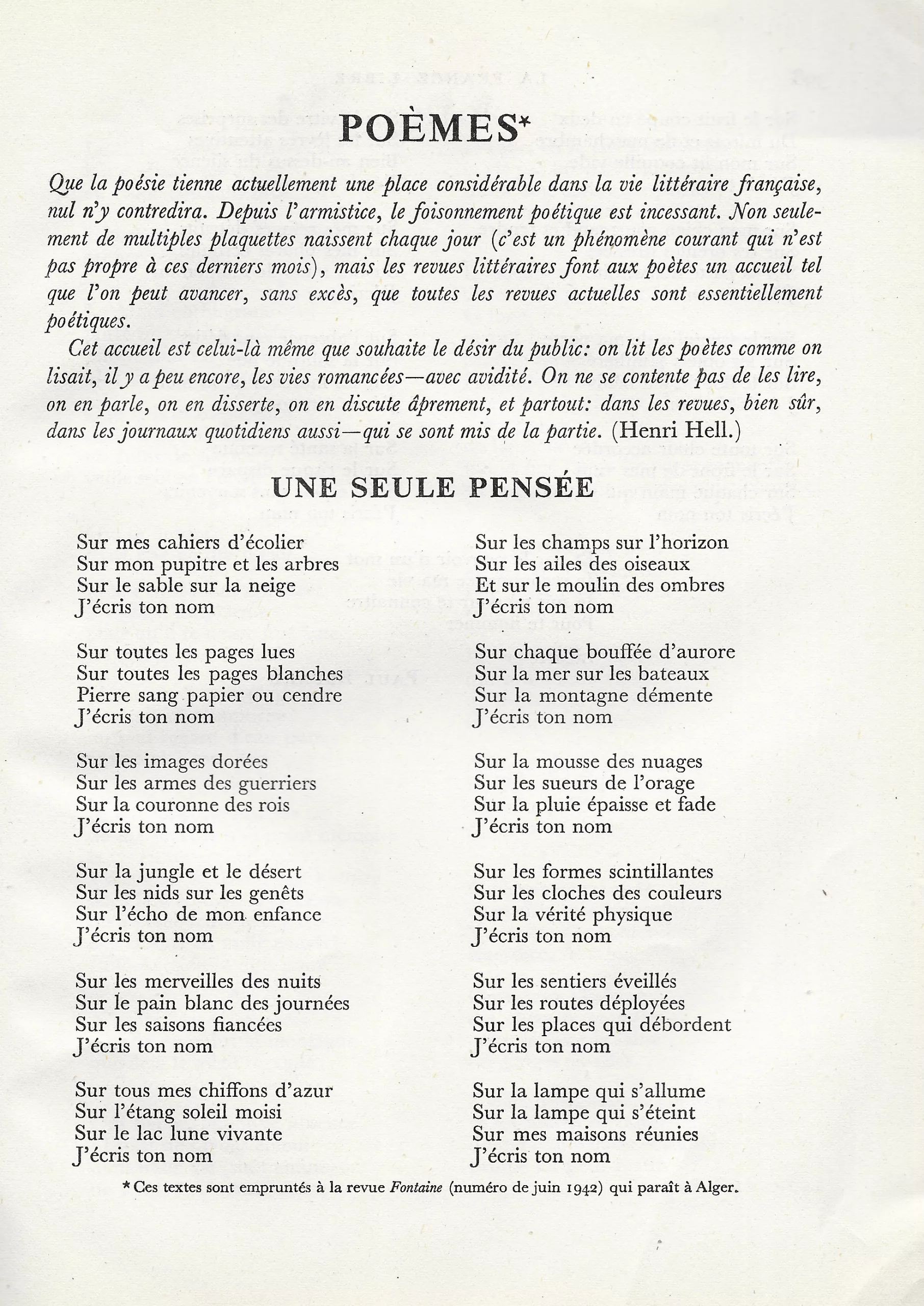 Cette parution précède d’une quinzaine de jours la publication en volume de La Main à plume, à laquelle Paul Eluard et Noël Arnaud s’affairent à Paris, dans laquelle le poème paraîtra sous son nom définitif de » Liberté » , au sein du recueil Poésie et vérité 1942.