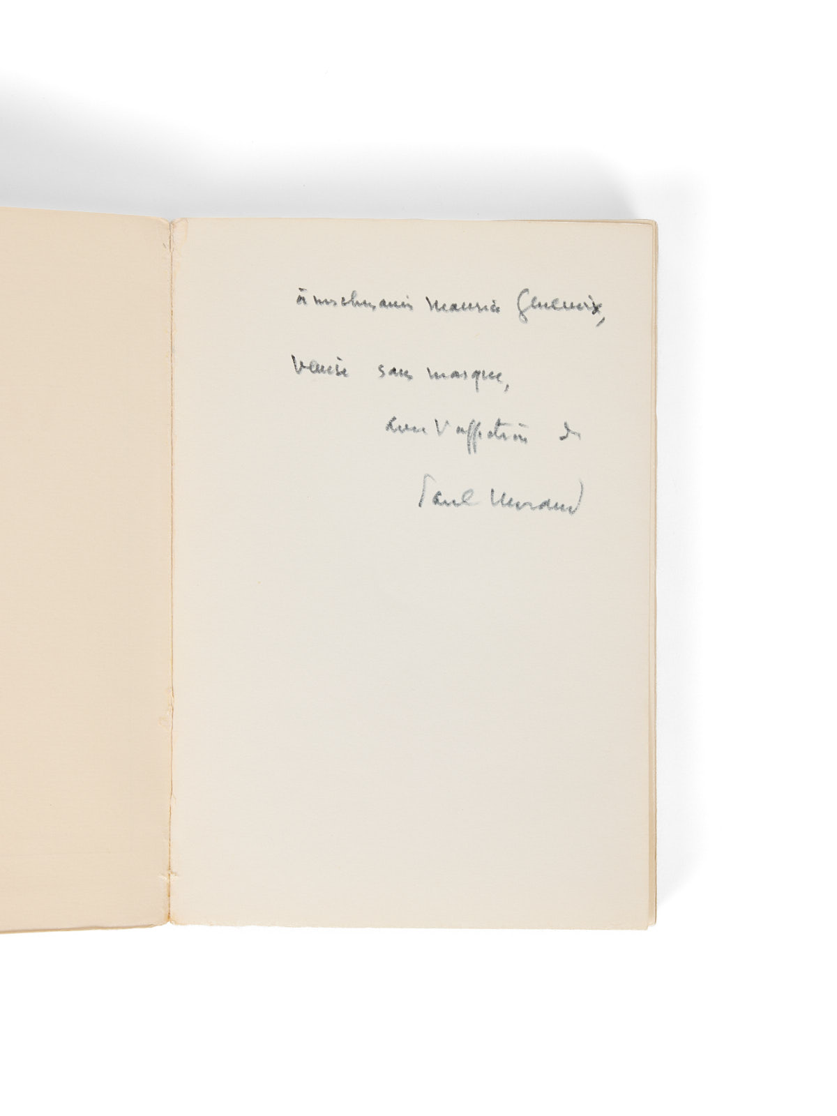 Édition originale. Illustré d'une photographie en frontispice. Il n'a été tiré que 65 exemplaires sur pur fil en grands papier.Un des exemplaires poinçonnés du service presse. Envoi signé : « à mes chers amis Maurice Genevoix, Venise sans masque, avec l'affection de Paul Morand ».