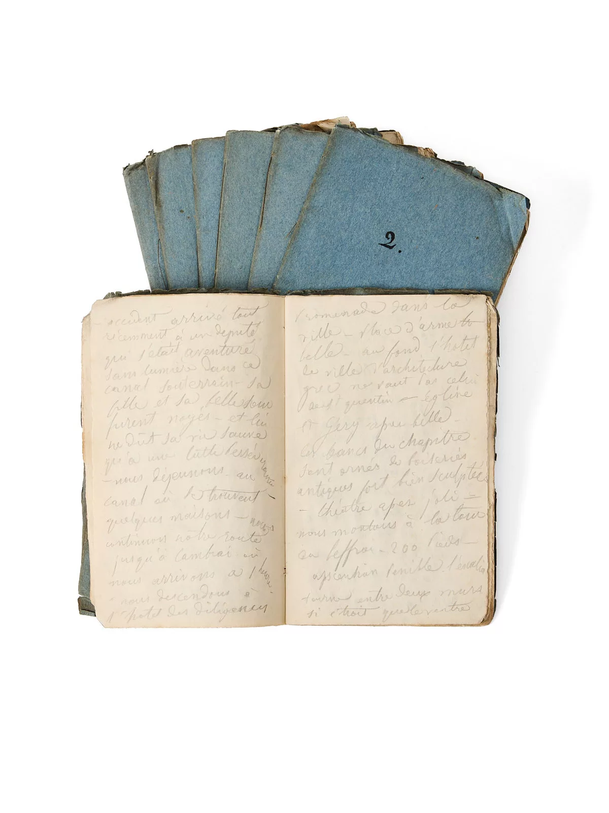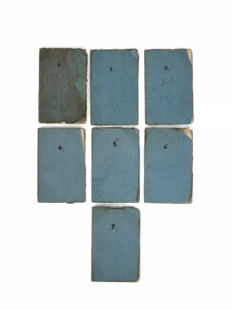 7 carnets (162 x 100 mm) de 6 et 24 f et 1 et 34 f, rédigés à la mine de plomb, Brochés, sous couverture bleue, chemise et étui (Elbel Libro).